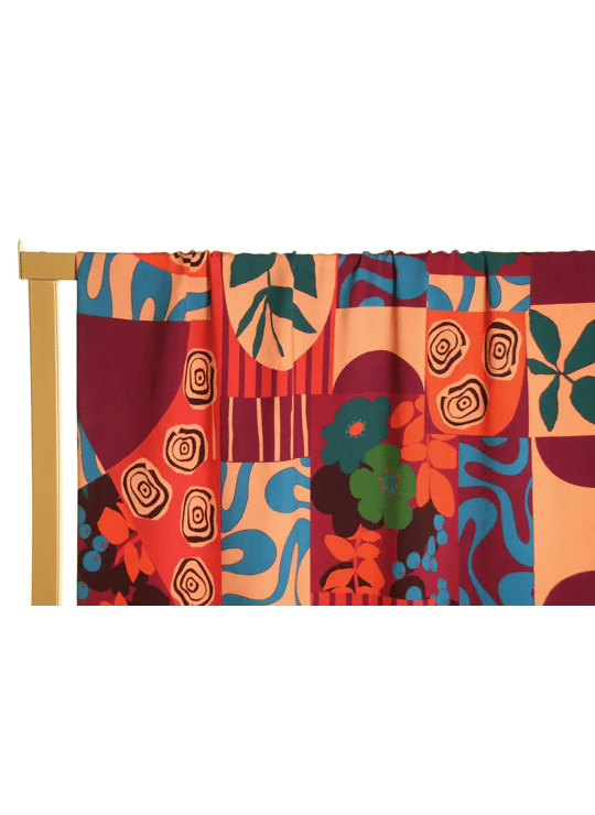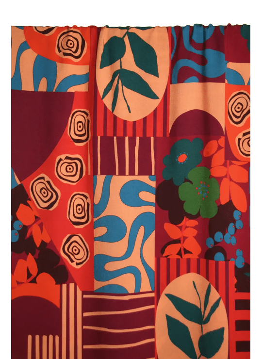Een roodkleurige viscose met leuke patchworkprint. Deze stof is geschikt voor blouses, jurken, rokken,... Atelier Jupe maakte de Tilde jurk in deze stof.