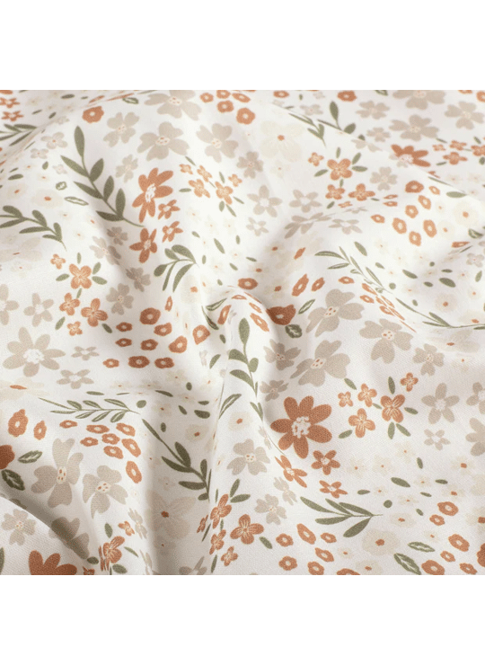 Deze stof heeft een bloemenprint in zachte kleuren op een ecru achtergrond