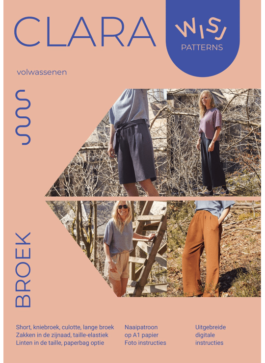 Clara is een naaipatroon voor een lange broek, kniebroek, culotte & short. Met als opties: zakken in de zijnaad, taillelint, plooitjes vooraan.