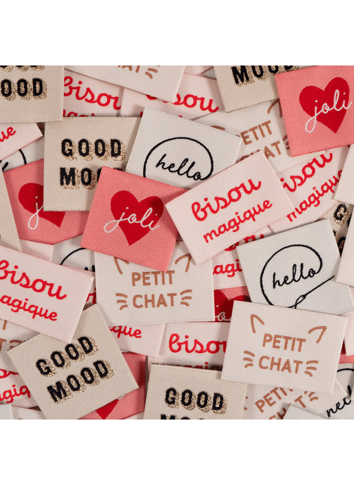 Set van vijf geweven en voorgevouwen labels. Uitstekende kwaliteit, heel zacht en OEKO-TEX® Standard 100 gecertificeerd.