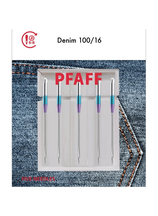 Denim naaimachinenaalden van Pfaff. Geschikt voor alle machines. 5 naalden per doosje, dikte 100/16.