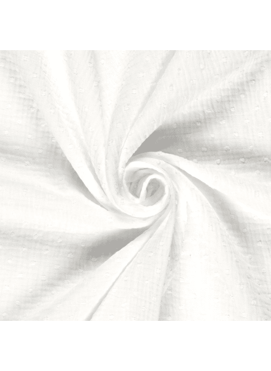 Leuke double gauze stof dobby met stippen. Kan onder andere gebruikt worden voor Blouses, Baby kleding, Broeken, Jurken, Overhemden, en meer…
