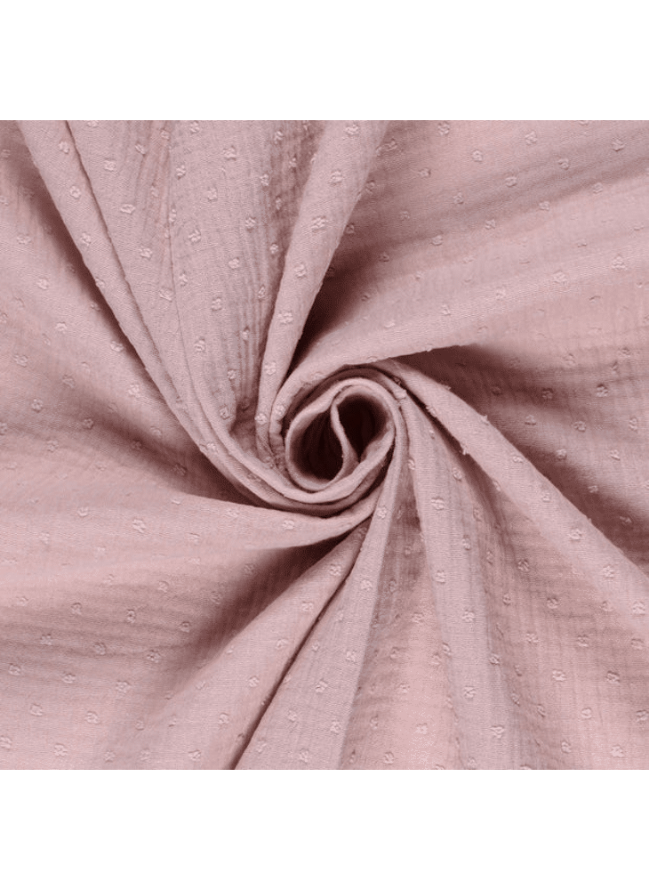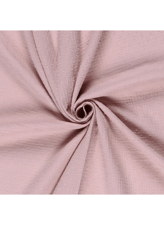 Mooie double gauze met dobby stippen. 100% katoen, 135 cm breed. Gewicht: 130 g/m².