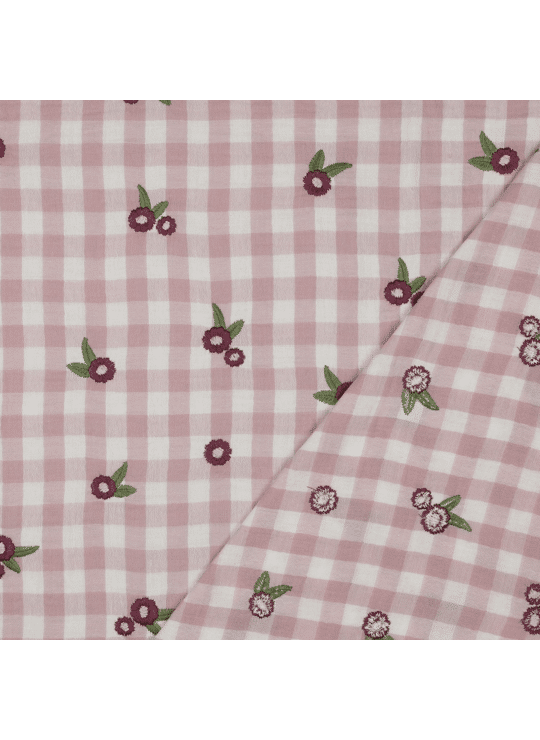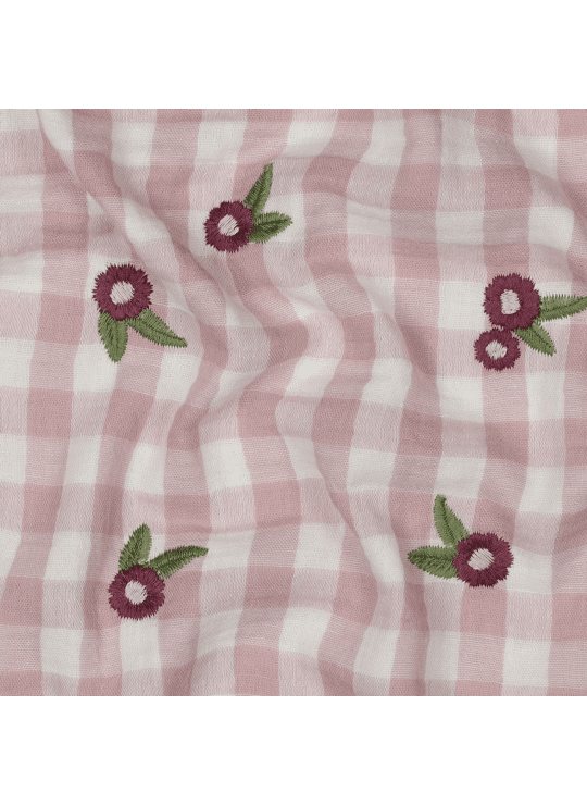 Double gauze, rooswitte ruiten met geborduurde bloemetjes