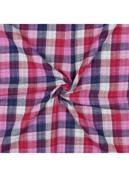 Op zoek naar een zachte, ademende stof met een unieke twist? Onze dubbelzijdige double gauze met ruitjes is een echte favoriet! Deze stof bestaat uit twee lagen fijne mousseline die op een subtiele manier aan elkaar zijn geweven – heerlijk soepel én comfortabel.
