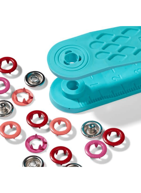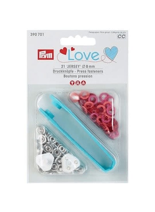 Deze Prym Love jersey drukknopen met ringvormige, open kap vallen op door de harmonische kleurencombinaties. Ze zijn geschikt voor dunne tricot (jersey) en lichte stoffen en hebben een lichte sluitkracht - ideaal voor bijvoorbeeld baby- en peuterkleertjes, zoals rompertjes of truitjes waarbij drukknopen op de schouders het aan- en uitkleden een stuk makkelijker maken. Bij de jersey drukknopen is er nagenoeg geen kans dat tricot of andere dunne, gebreide stof gaat ladderen, want er hoeft niet eerst een gaatje in de stof te worden geponst - de ring met tandjes duwt de weefseldraden enkel opzij zonder ze te beschadigen. Ze zijn geschikt voor bevestiging met een drukknopentang. De drukknopen zijn gemaakt van messing, hebben een open en ringvormige kap, hebben een doorsnee van 8mm en zijn verkrijgbaar in diverse combinaties van drie harmonische kleuren. Een blisterverpakking bevat 21 drukknopen, 2 matrijzen, 1 matrijzenhouder en een gebruiksaanwijzing.