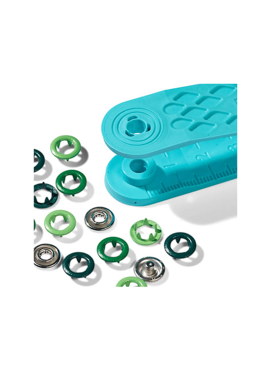 Metalen drukknopen van Prym - assortiment groen. Dit doosje bevat voldoende voor 21 knopen, inclusief de opzetstukken. Doorsnede 8 mm.