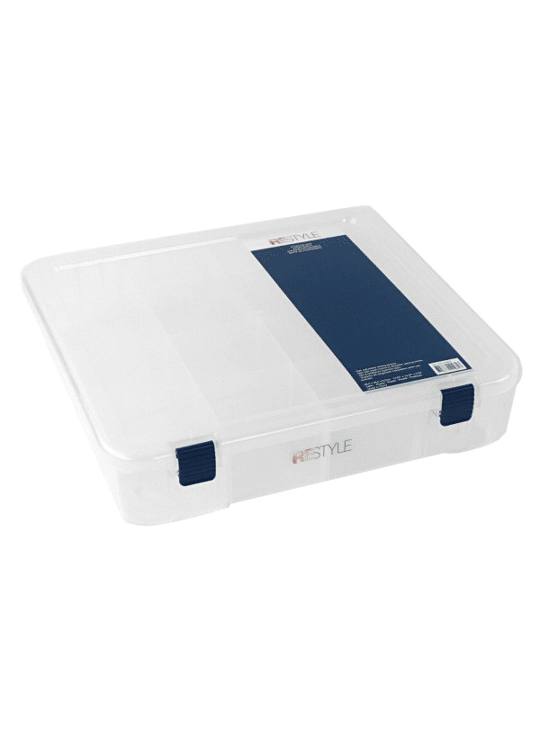 De box is gemaakt van stevig, transparant plastic — je ziet in één oogopslag wat erin zit, en hij kan tegen een stootje. Met een formaat van 356 x 365 mm en een hoogte van 85 mm biedt hij genoeg ruimte voor grotere spullen, zonder dat hij log aanvoelt.