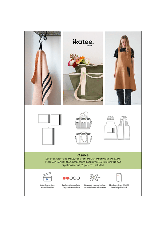 Osaka is een set patronen om 5 keukenaccessoires te maken: placemats en servetten, een theedoek met verstekhoeken, een Japans schort en een shopper met binnen- en buitenzakken. De modellen kunnen gemaakt worden in een effen versie, in twee- of driekleur (voor de shopper), of met contrasterende katoenen keperband. Ontdek onze keukenaccessoires met zeer verzorgde afwerkingen.