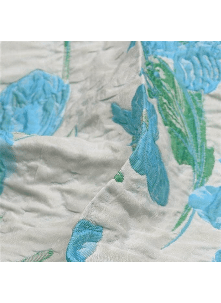 Deze prachtige polyester jacquard combineert verfijning met een subtiel reliëf dat het licht op elegante wijze vangt. De ingeweven bloemmotieven in frisse tinten blauw en groen geven de stof een luxueuze uitstraling met een artistieke twist.
