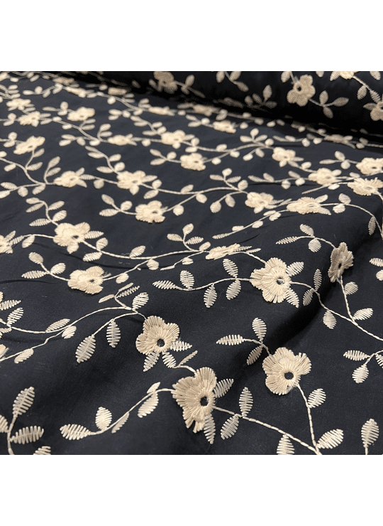 De geborduurde bloemen geven de stof een decoratieve en charmante uitstraling, perfect voor elegante kledingstukken zoals blouses, rokken en jurken, maar ook voor interieurprojecten zoals kussens of tafellopers.