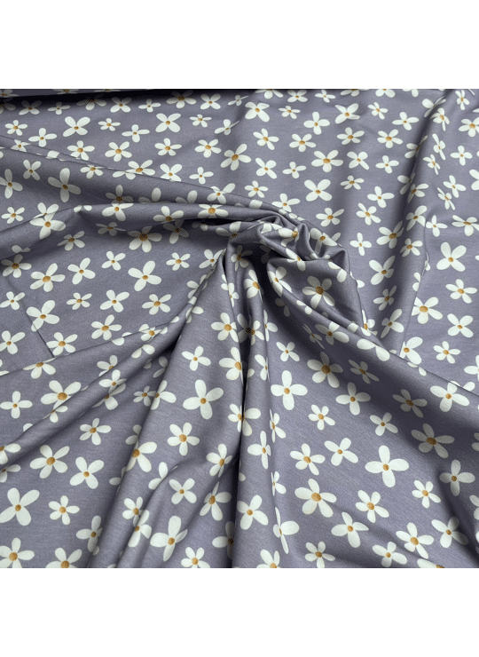 Deze tricot heeft een print van mooie madeliefjes op een lila achtergrond.