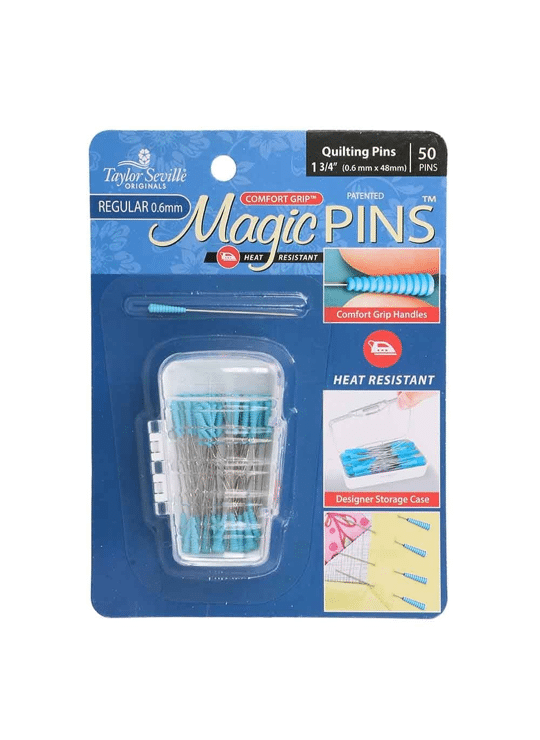 De Magic quiltspelden van Taylor Seville zijn geschikt voor het bij elkaar houden van meerdere lagen stof en tussenvulling en dikke, volumineuze stoffen. Ze zijn gemaakt van metaal en hebben een hittebestendig kunststof handvat. U kunt dus gewoon over de spelden heen strijken. Bovendien heeft u dankzij de ribbels op het handvat een goede grip. Door de blauwe kleur van het handvat zijn de spelden gemakkelijk terug te vinden in uw werk. De spelden van Taylor Seville zitten in een handig opbergdoosje met een scharnierdeksel van transparante kunststof. De Magic quiltspelden zijn 48mm lang en verkrijgbaar in twee verschillende diktes: fijn (0,5mm) en regular (0,6mm). Geleverd per 1 verpakking van 50 of 100 spelden.