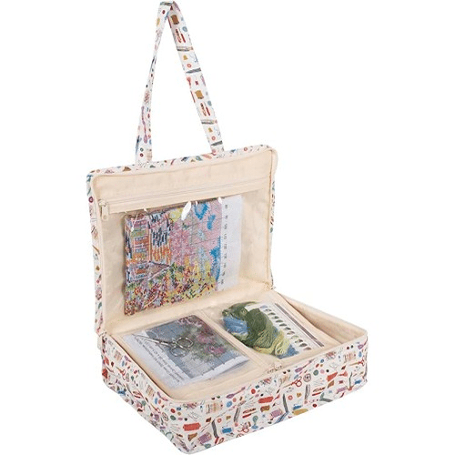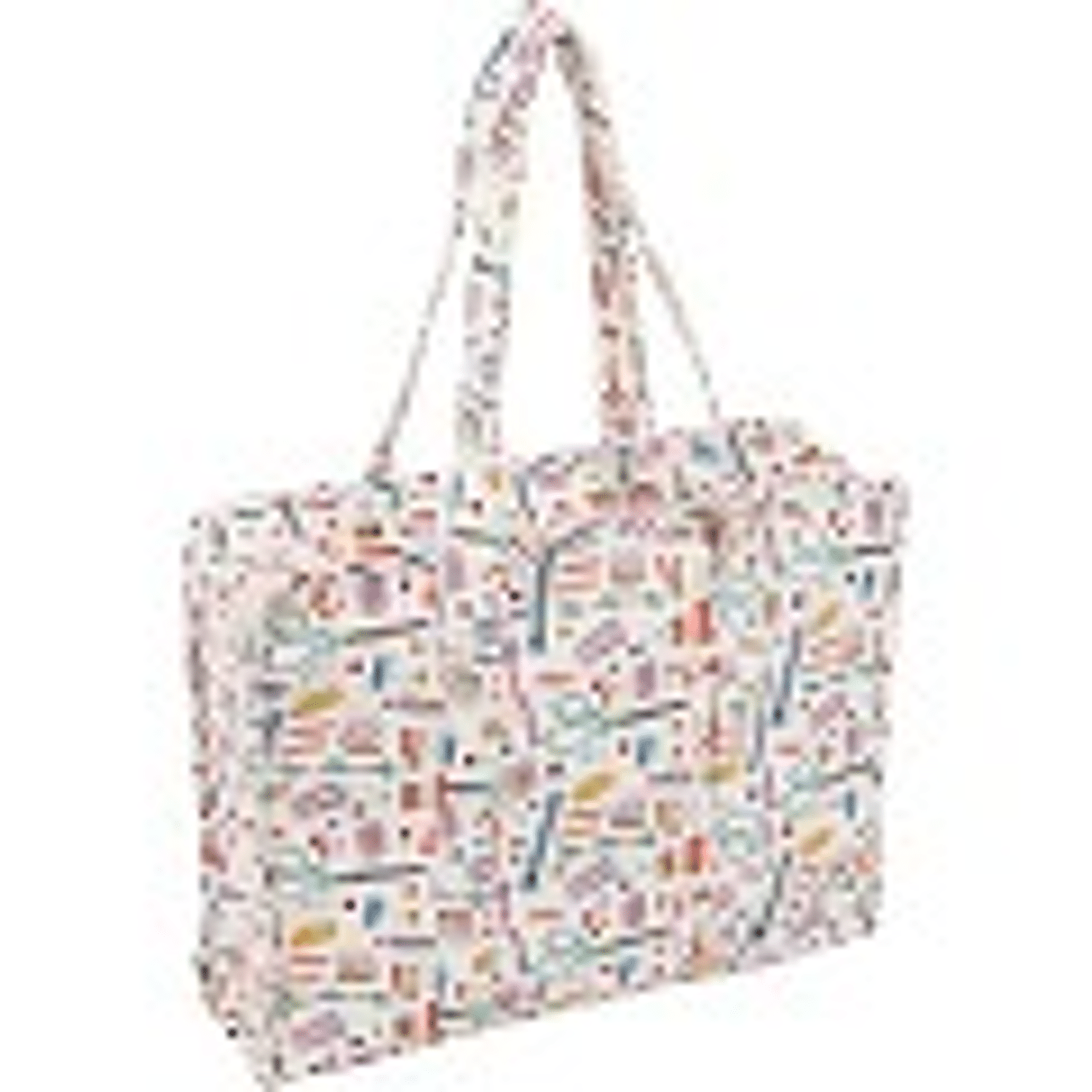 Zachte handwerktas met ritssluiting van katoenen stof met print, geïnspireerd op kunst en ambacht. Voorzien van transparante kunststof insteekvakken om projecten, patronen of materialen in op te bergen. Er is een ruim hoofdvak. Daarnaast zijn er elastische lussen om naaigerief, gereedschap en accessoires veilig op hun plaats te houden.
