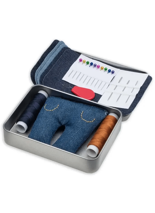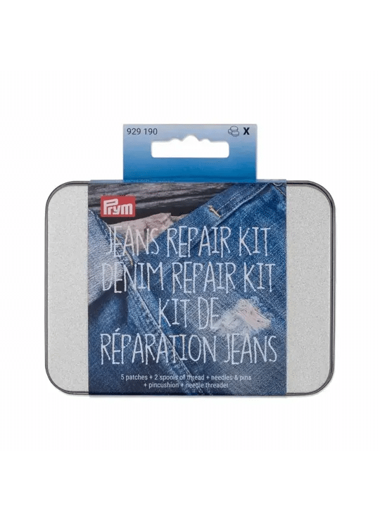 Met de Prym naaikit voor jeans repareer je eenvoudig je favoriete spijkerbroek. Bevat strijkbare en opnaai-patches, naaigaren, naalden en meer. Ideaal voor scheuren of creatieve steken. Verpakt in een handig blikje voor duurzaam herstel!