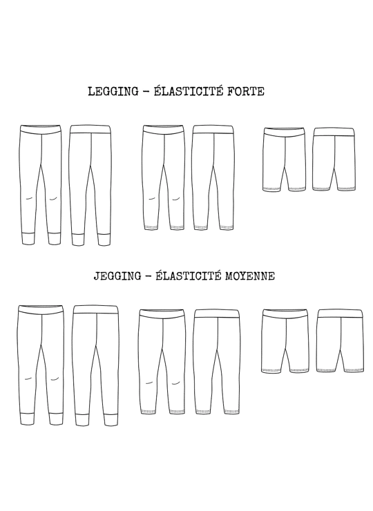 2 modellen: Legging: voor zeer rekbare stoffen zoals jersey of stretch rib. Jegging: voor middelmatig rekbare stoffen zoals fleece of French terry met elastaan.