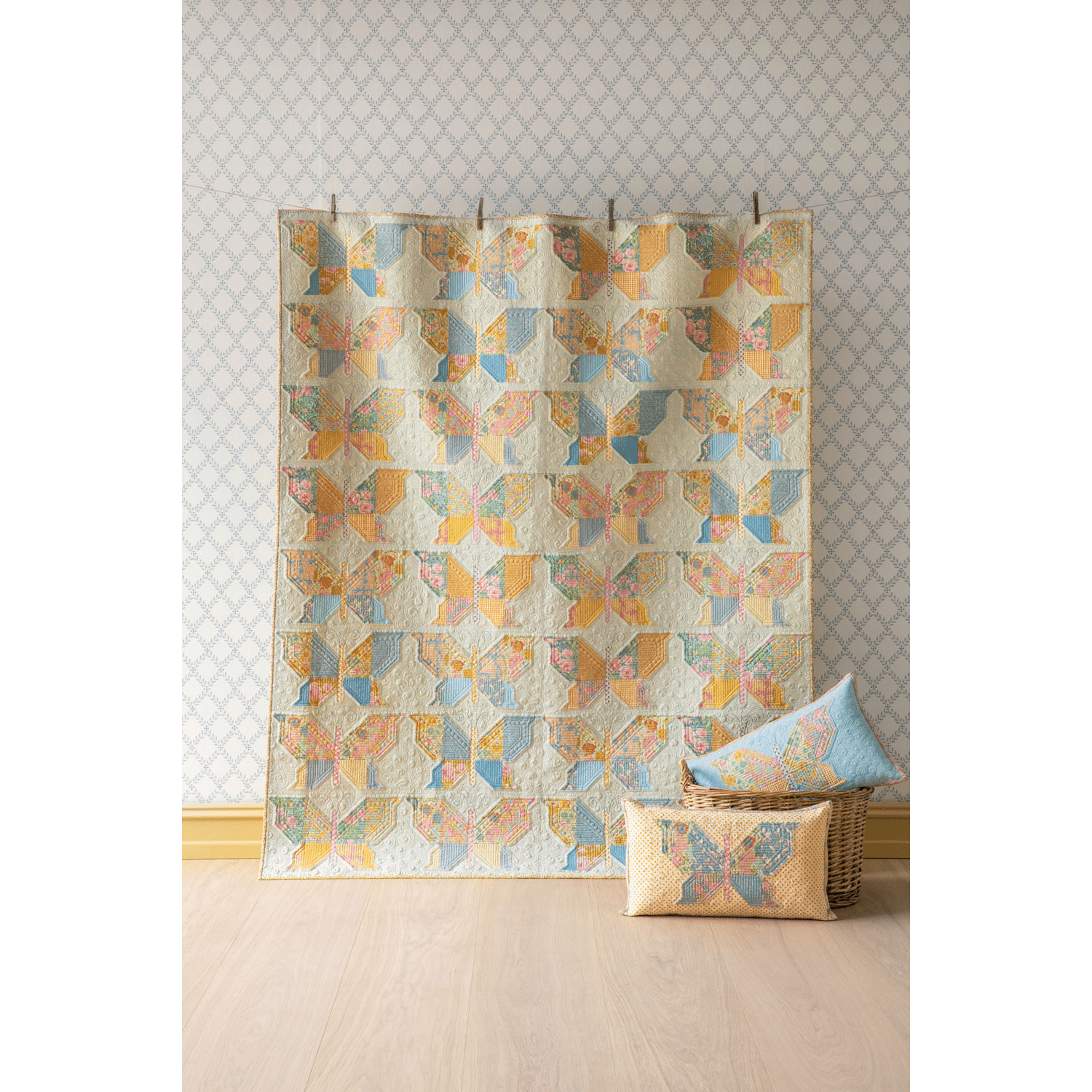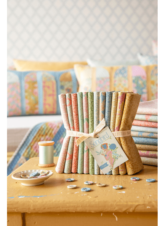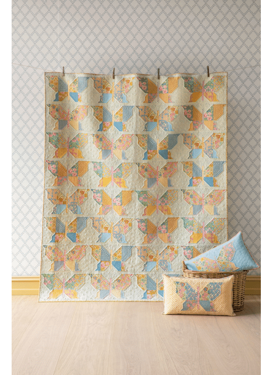 Bij Songbird horen ook mooie quiltontwerpen. De bekende Mosaic Butterfly Quilt is er opnieuw in deze zachte kleuren, samen met de Garden View en Soirée quilts en kussens. Een fijne collectie voor iedereen die houdt van lichte, romantische patchworkstoffen.