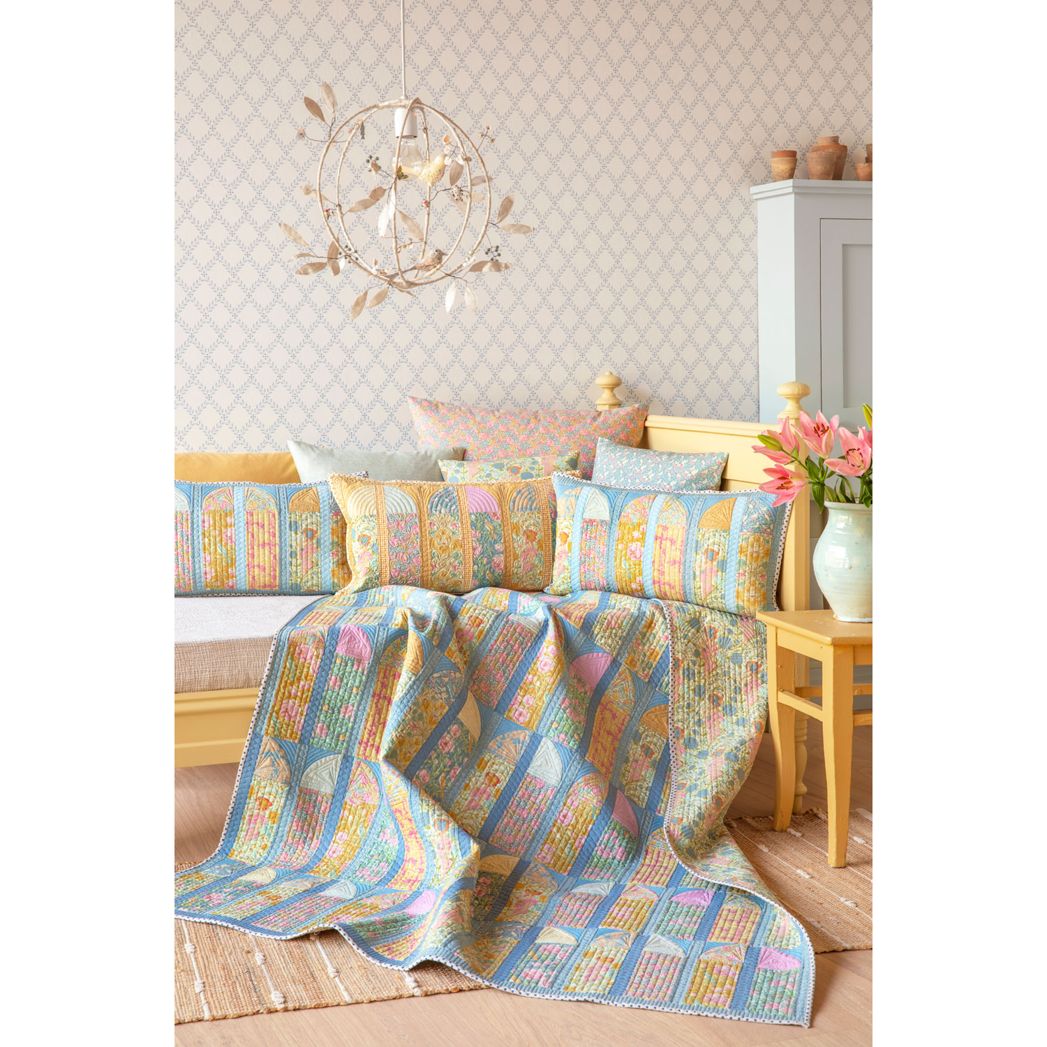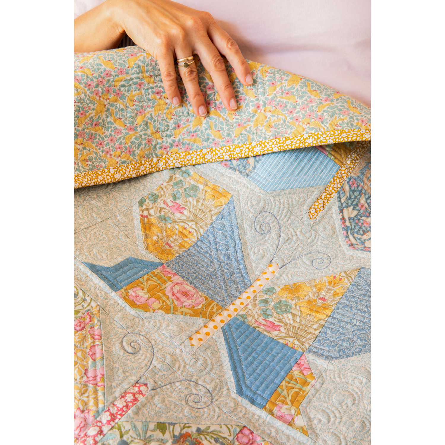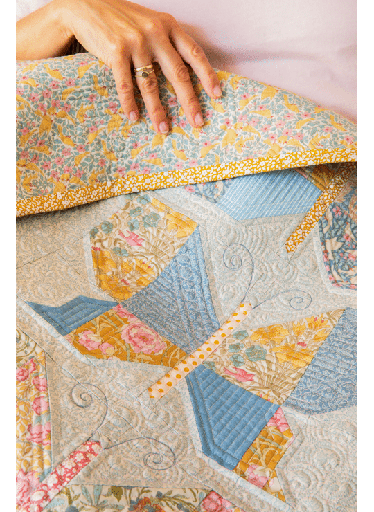 Bij Songbird horen ook mooie quiltontwerpen. De bekende Mosaic Butterfly Quilt is er opnieuw in deze zachte kleuren, samen met de Garden View en Soirée quilts en kussens. Een fijne collectie voor iedereen die houdt van lichte, romantische patchworkstoffen.