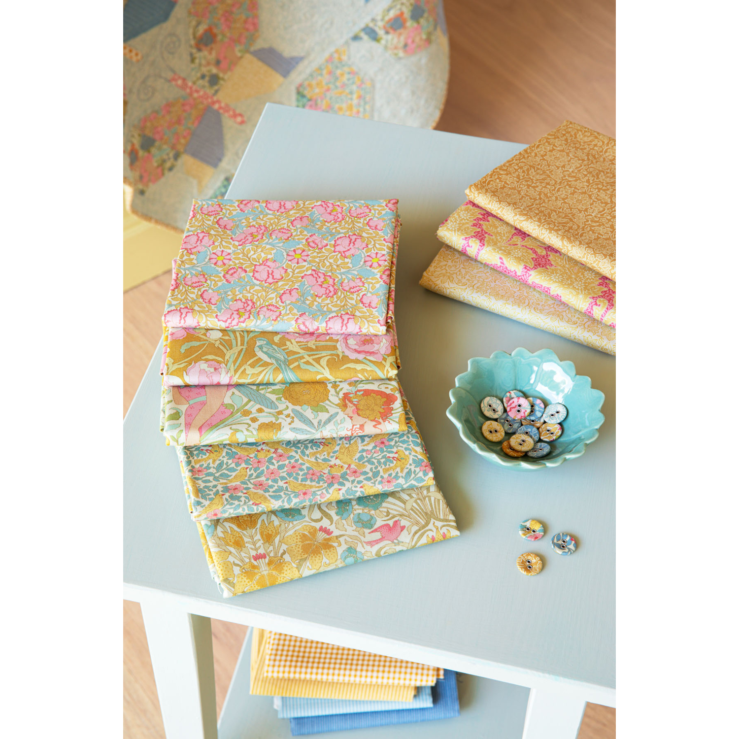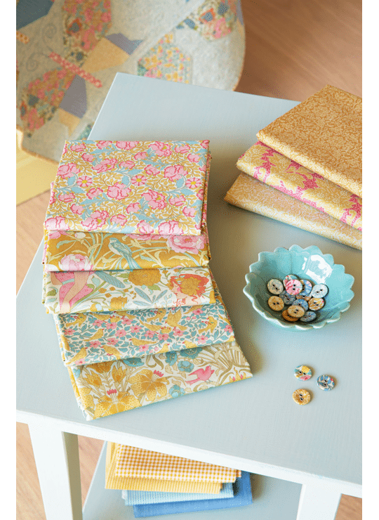 De collectie is uitgevoerd in lichte, zachte pasteltinten met een subtiel aquareleffect. Deze kleuren maken de stoffen makkelijk te combineren en perfect voor voorjaars- en zomerquilts, kussens en andere patchworkprojecten.