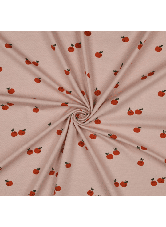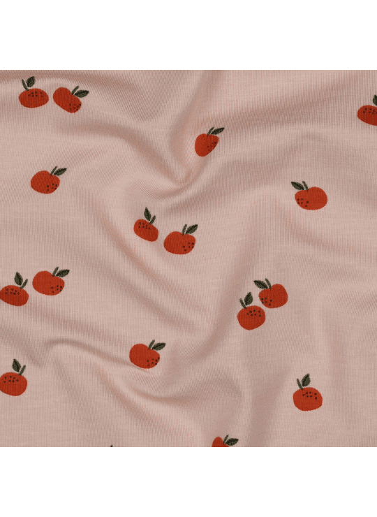 Prachtige en heel zachte tricot, zachtroze met print van sinaasappelen