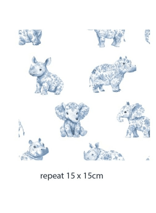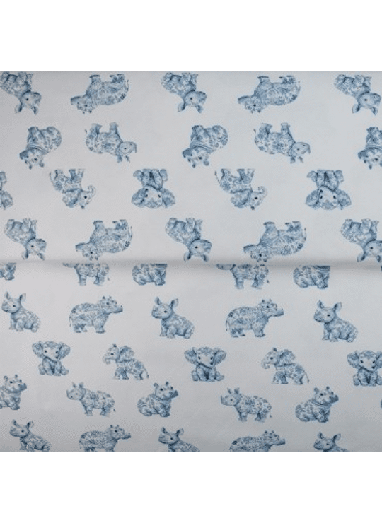 Deze tricot heeft een leuke print van blauwe olifanten, nijlpaarden en neushoorns op een witte achtergrond.