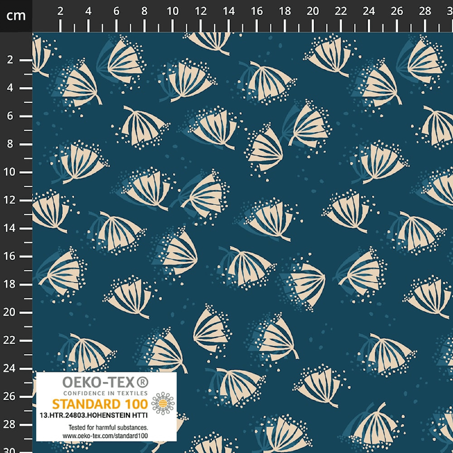 Mooie, soepelvallende tricot met print van (blaas)bloemen op een tealblauwe achtergrond
