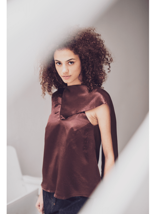 Deze mooi glanzende en soepelvallende stof wordt in Fibre Mood 37 van feb 2026 gebruikt voor de jurk Vendela, de top Willow en de blouse Sanna