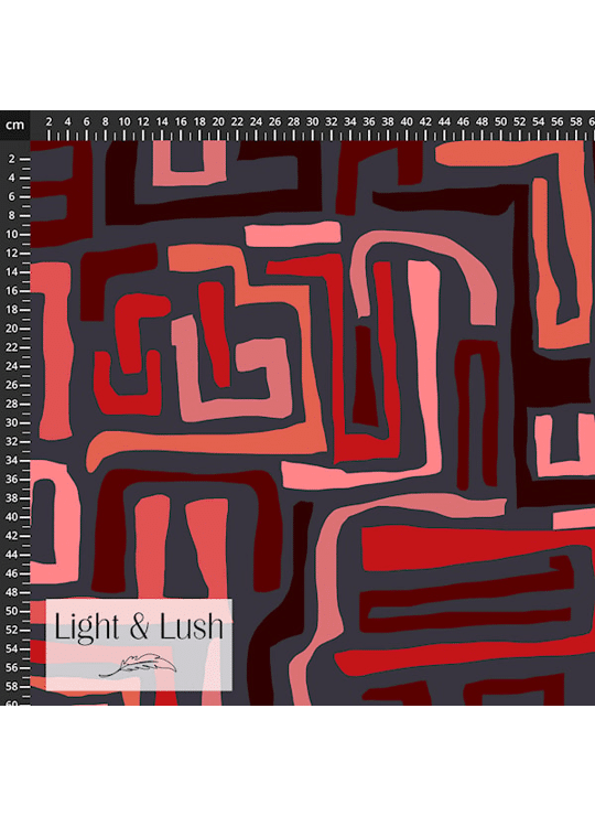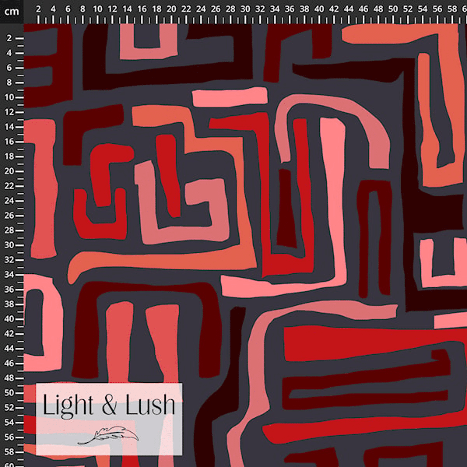 Abstracte print, kleuren: antraciet, rood, roze, oranje.