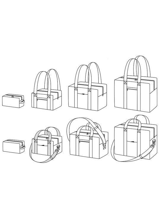 Voyage is een patroon voor een tas en toilettas die zich aan al uw behoeften aanpast (toilettas, reistas, yogatas, kinderdagverblijftas, schoudertas, handtas, enz.).