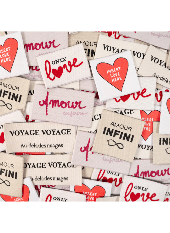 Set van vijf geweven en voorgevouwen labels. Uitstekende kwaliteit, heel zacht en OEKO-TEX® Standard 100 gecertificeerd.