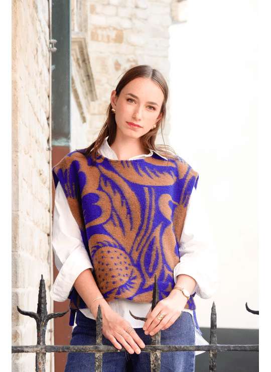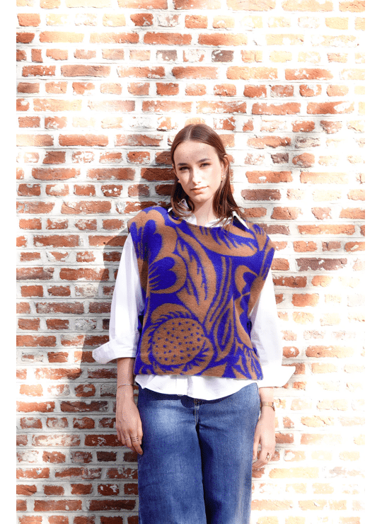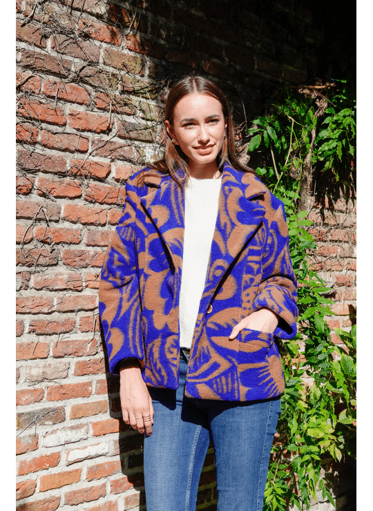 Een zachte winterstof in een mix van wol & polyester. De stof heeft een grote artistieke bloemenprint in koningsblauw en fuchsia en komt in 2 andere kleurvarianten. Perfect voor sweaters en jasjes. Dit is een gebreide stof.